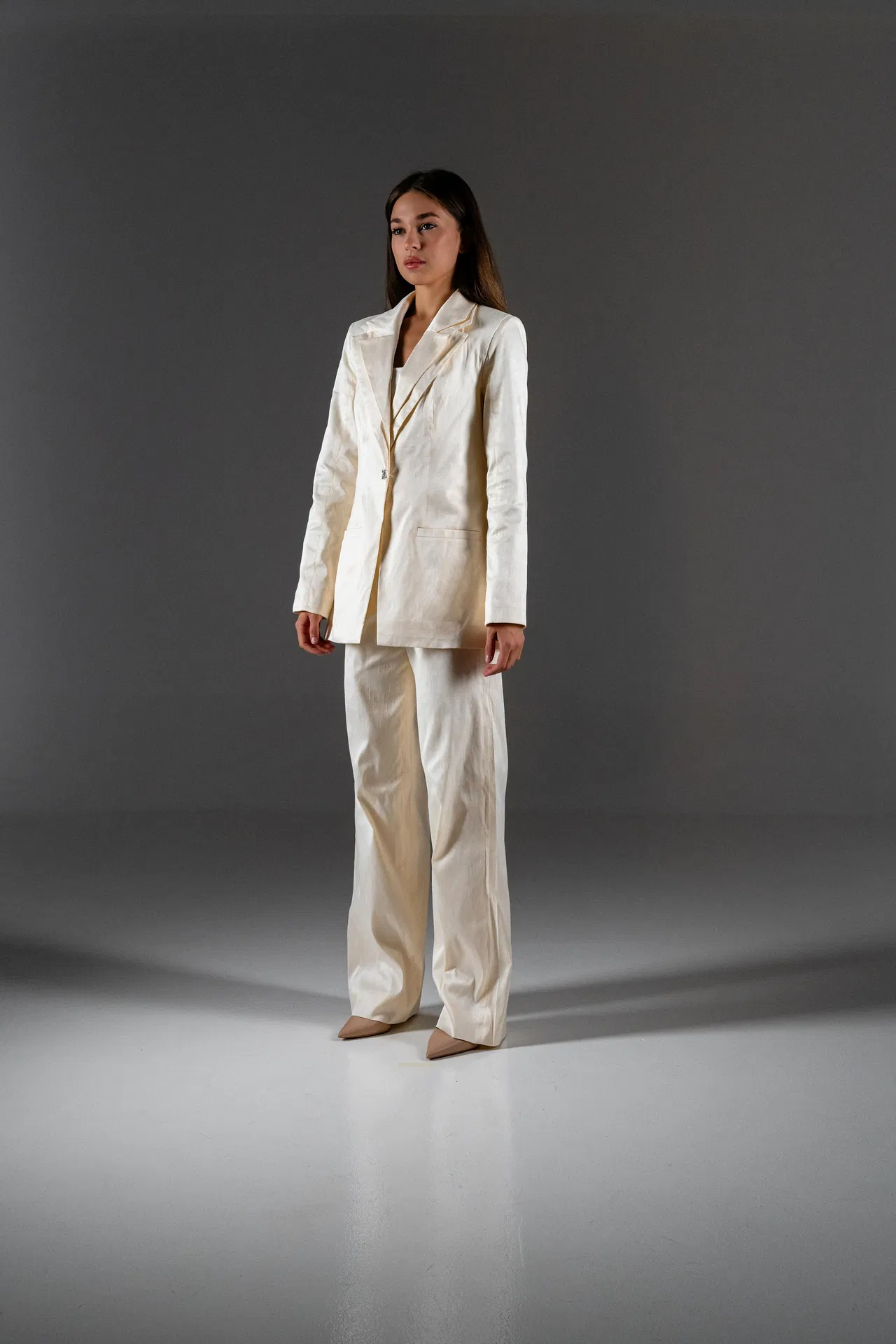 A refined two-tone linen blend suit that combines structured tailoring with soft, natural hues. The oversized double-breasted blazer features contrasting beige panels, paired with wide-leg trousers for an effortlessly elongated silhouette. A perfect expression of quiet confidence and modern elegance.