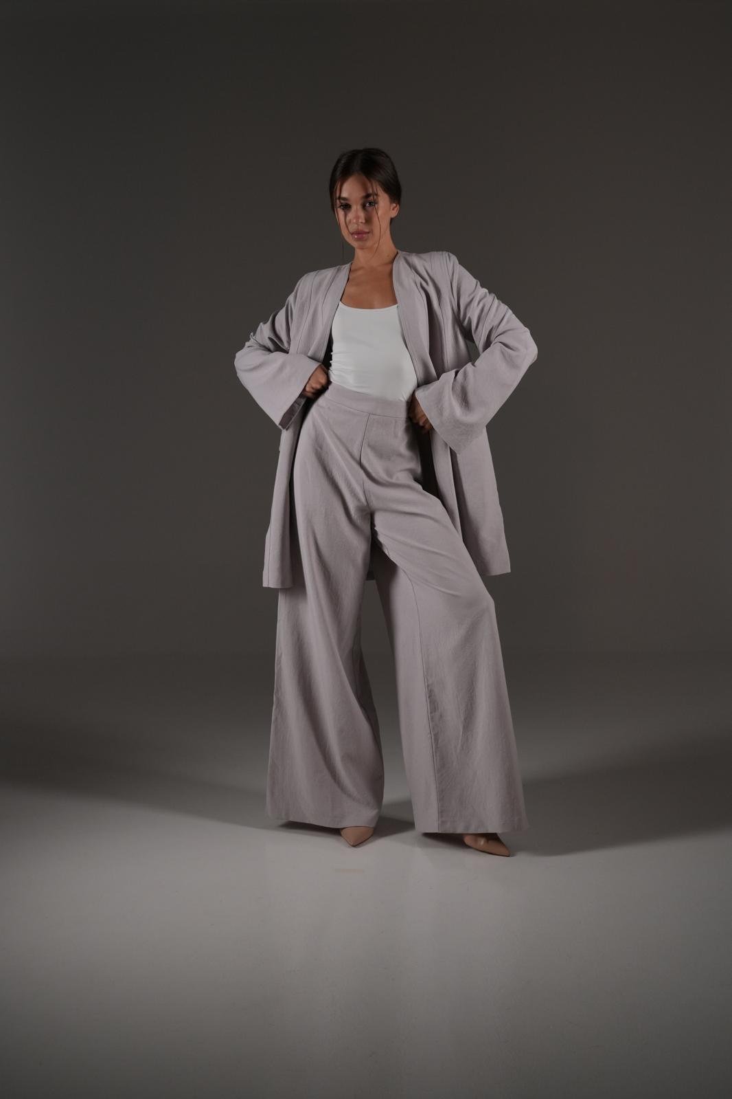 Soft yet commanding, this lilac ensemble redefines modern tailoring with a touch of serenity. The open-front blazer and flowy wide-leg trousers create a graceful, elongated silhouette — a perfect fusion of comfort, confidence, and minimalist sophistication.